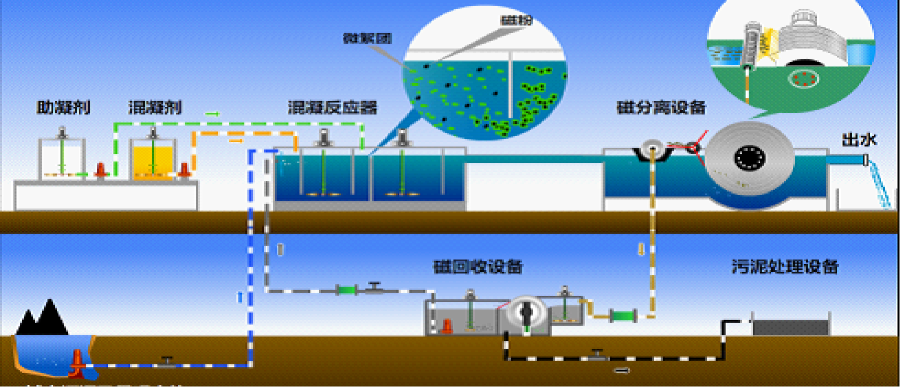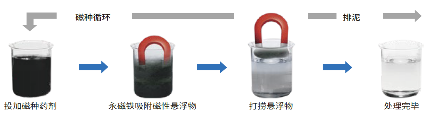 磁微滤净水技术是通过向污水中加入混凝剂、絮凝剂和可回收磁粉,污水中污染物质与磁粉凝聚成磁性絮体,提高混凝絮体的比重,从而增加表面负荷,提高污泥沉降速度和出水效果。磁性污泥再通过磁粉回收设备实现磁粉与污泥的分离;分离后的磁粉可以继续回用,参与下一次的絮凝过程,达到循环利用。分离后的污泥浓缩脱水后外运。