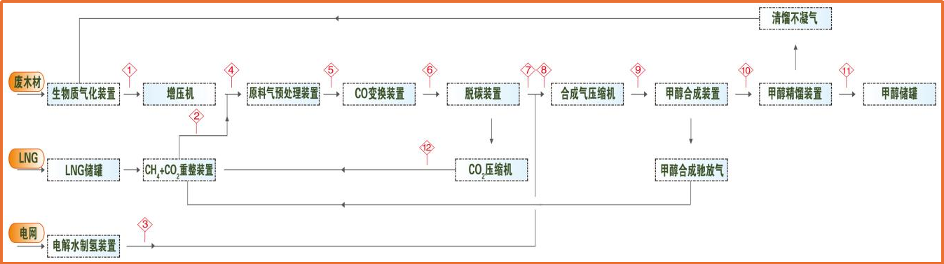 20000吨/年绿色甲醇项目,采用生物气化、甲烷+CO2重整、电解水制氢等工艺制取甲醇合成所需的CO、H2、CO2的原料气,原料气经过一系列的单元处理后,采用一氧化碳加氢的方式合成甲醇,合成的甲醇用于船舶燃料或化学原料。